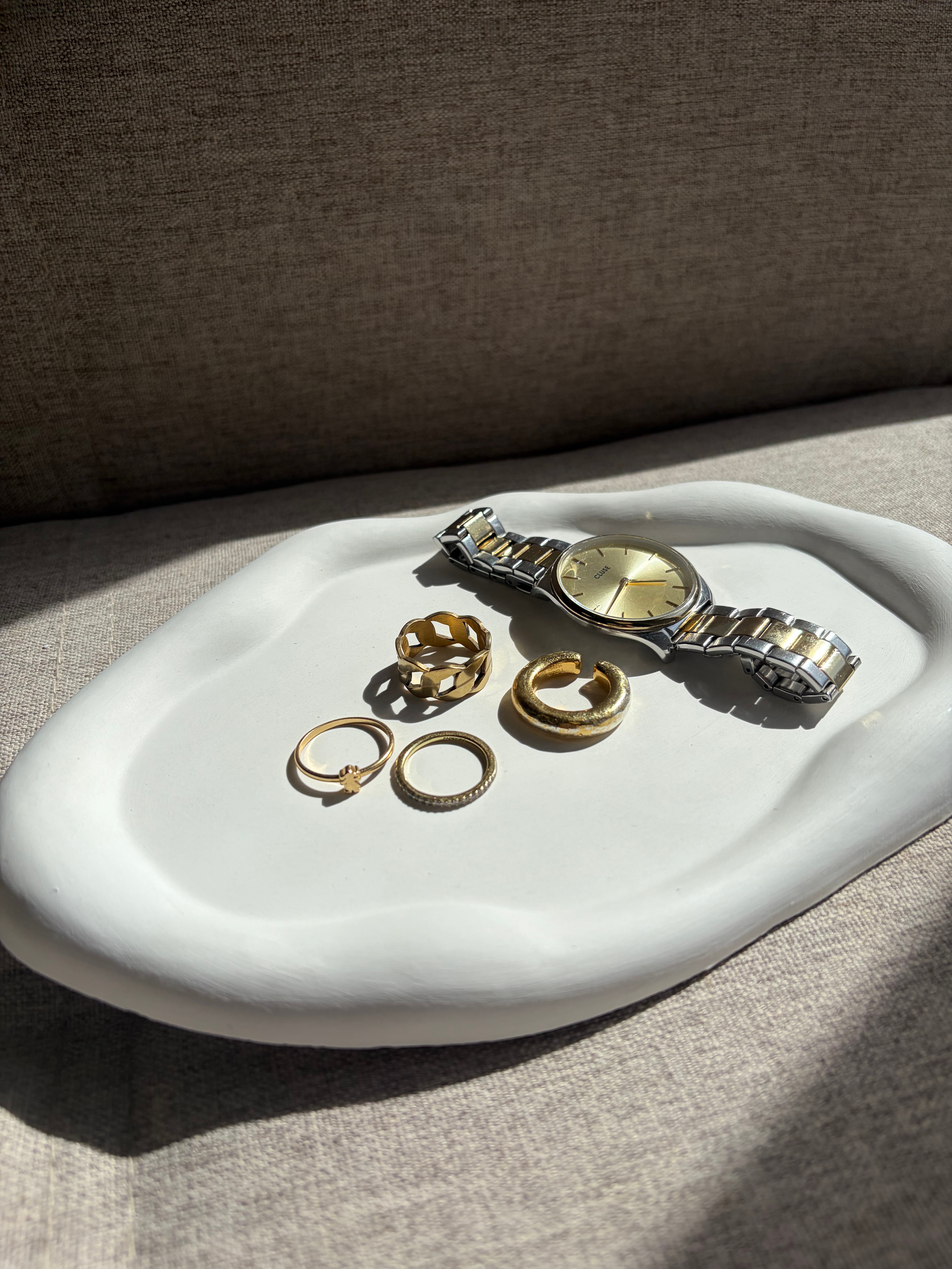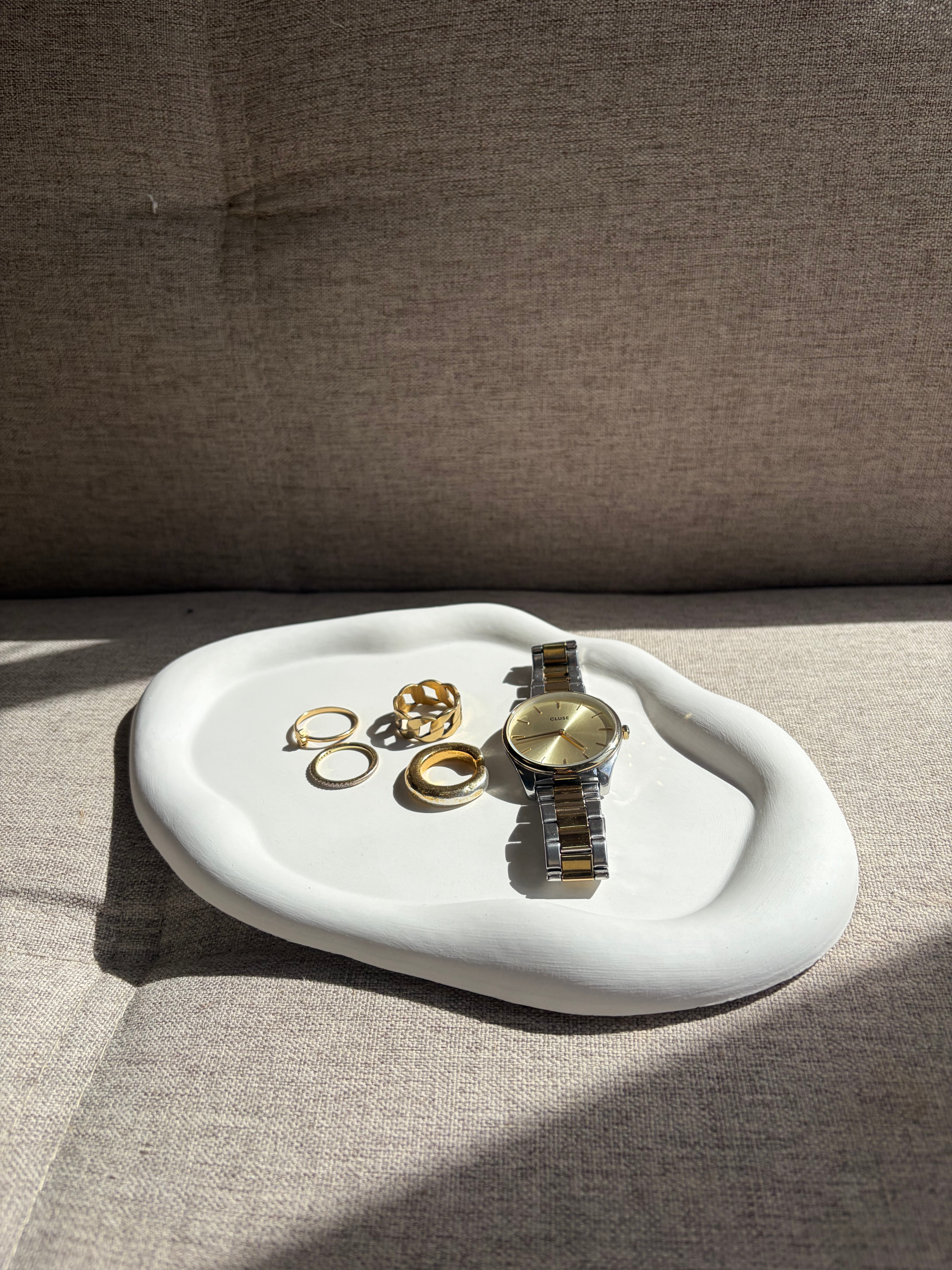 Hecha a mano en yeso, cada pieza es única, con pequeñas variaciones que reflejan su proceso artesanal. Perfecta para organizar objetos, acompañar velas o realzar pequeños detalles decorativos. Su diseño discreto aporta un toque de calma y estilo a cualquier espacio.