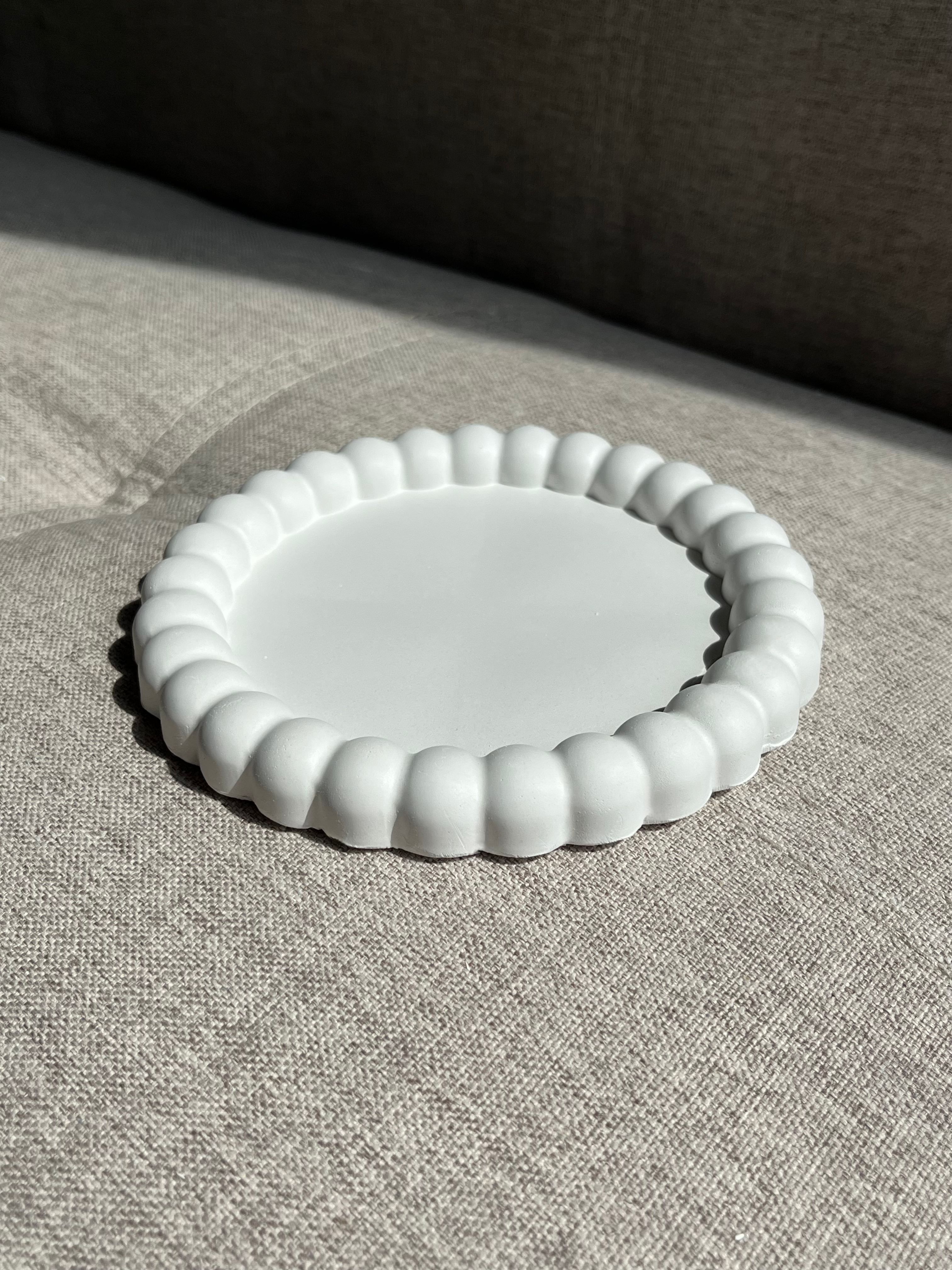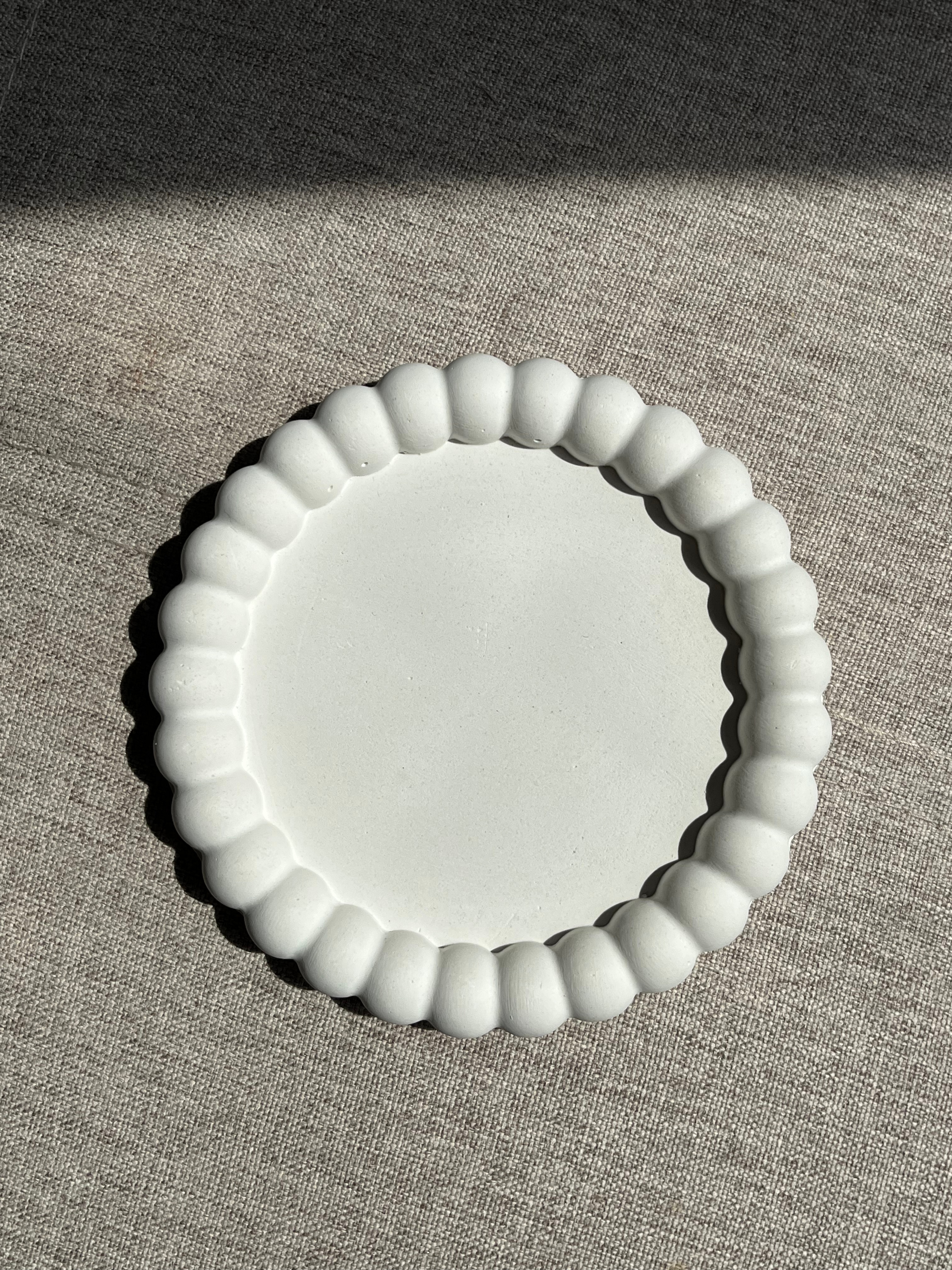 Bandeja redonda artesanal de diseño elegante y delicado, con un borde de pequeñas perlas de yeso. Ideal para velas, joyas, inciensos o como elemento decorativo. Su acabado mate y estilo simple encajan en ambientes serenos y cálidos. Cada pieza es única gracias a su elaboración artesanal.