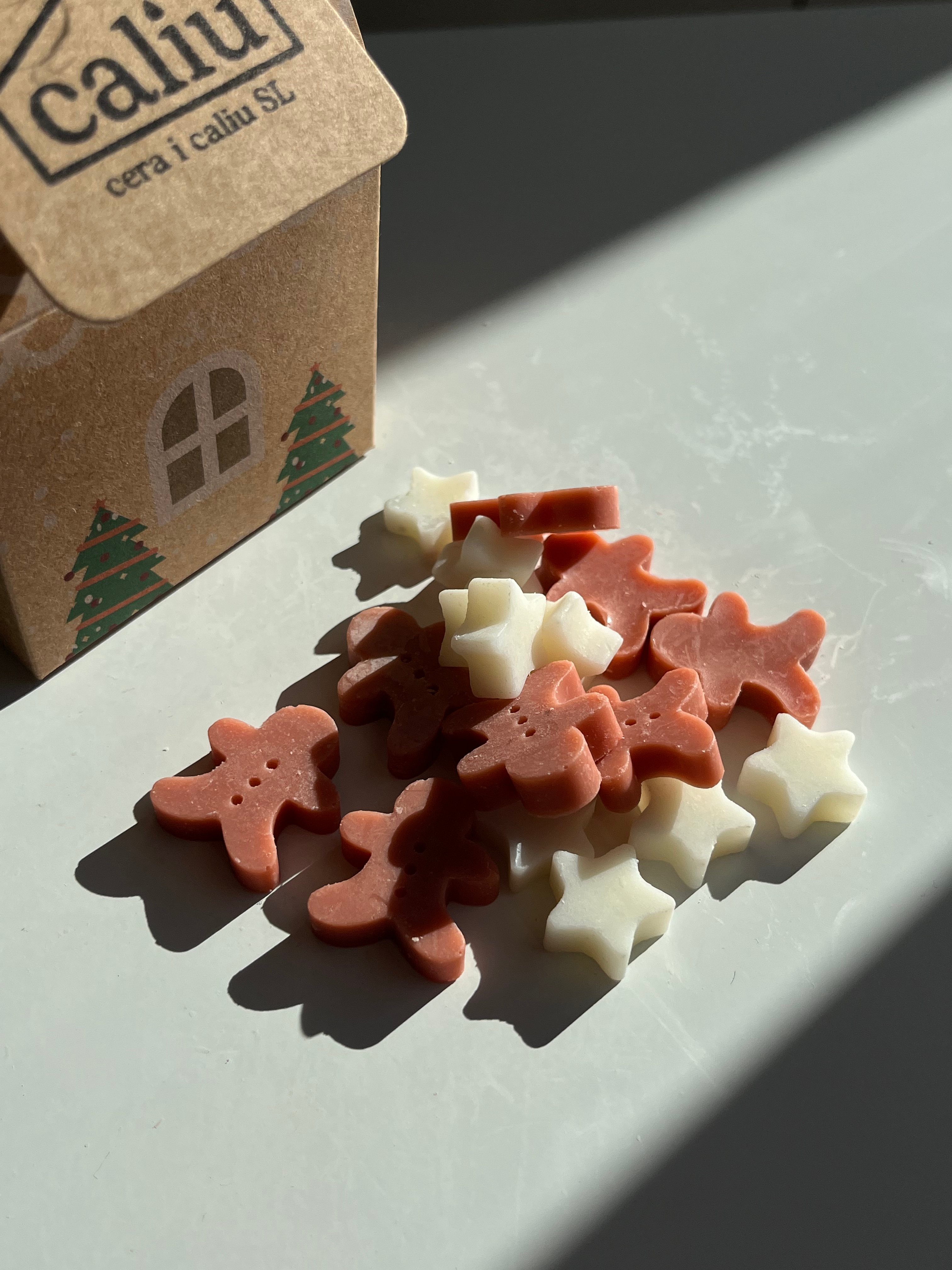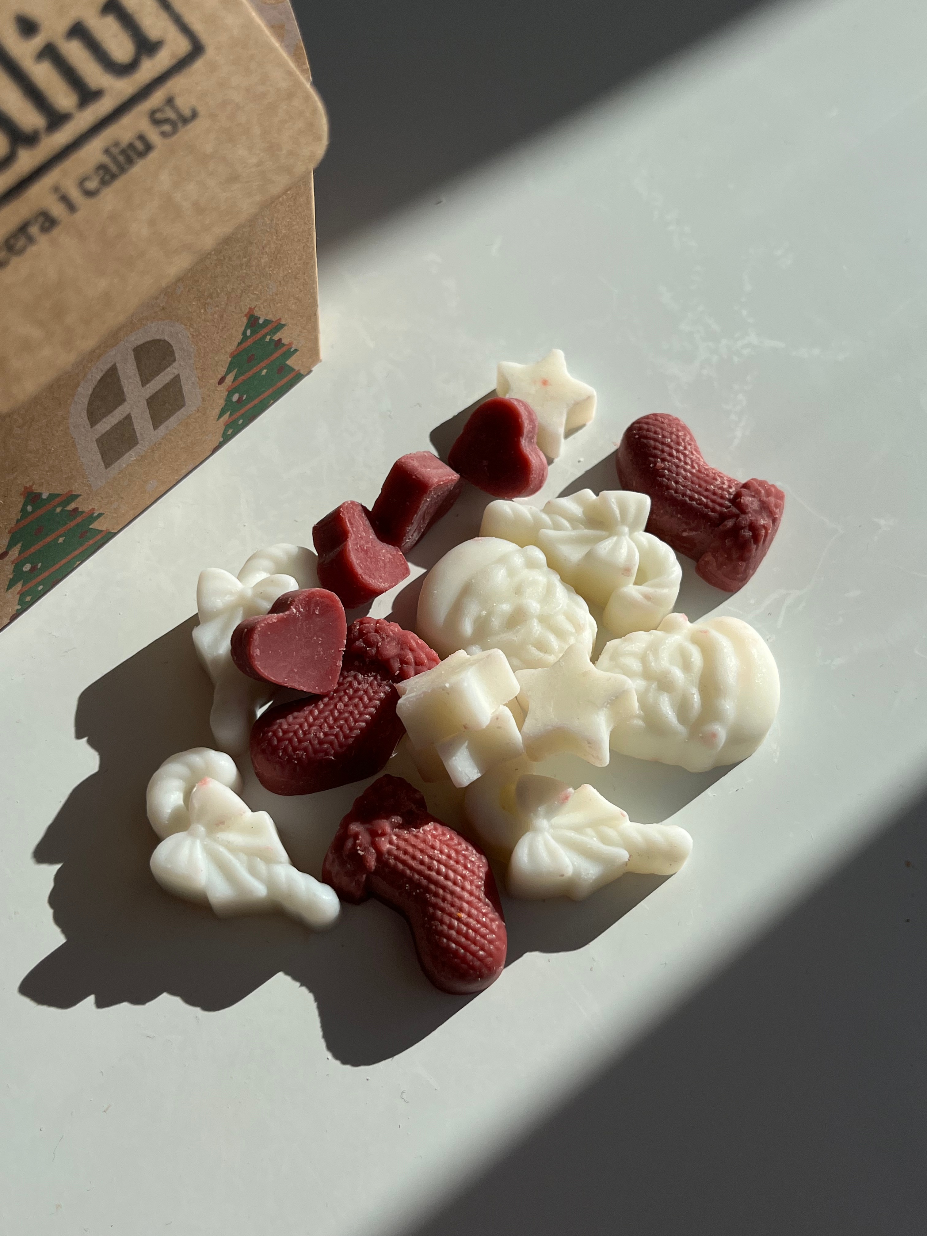 Incluye un quemador artesanal, 4 velas de té sin aroma, un paquete de wax melts de 50 g (aroma a escoger entre los clásicos y los navideños Christmas Hug, Abeto Navideño, Sándalo y Bergamota, Café Tostado o Dulces de Navidad) y cerillas Caliu de regalo.