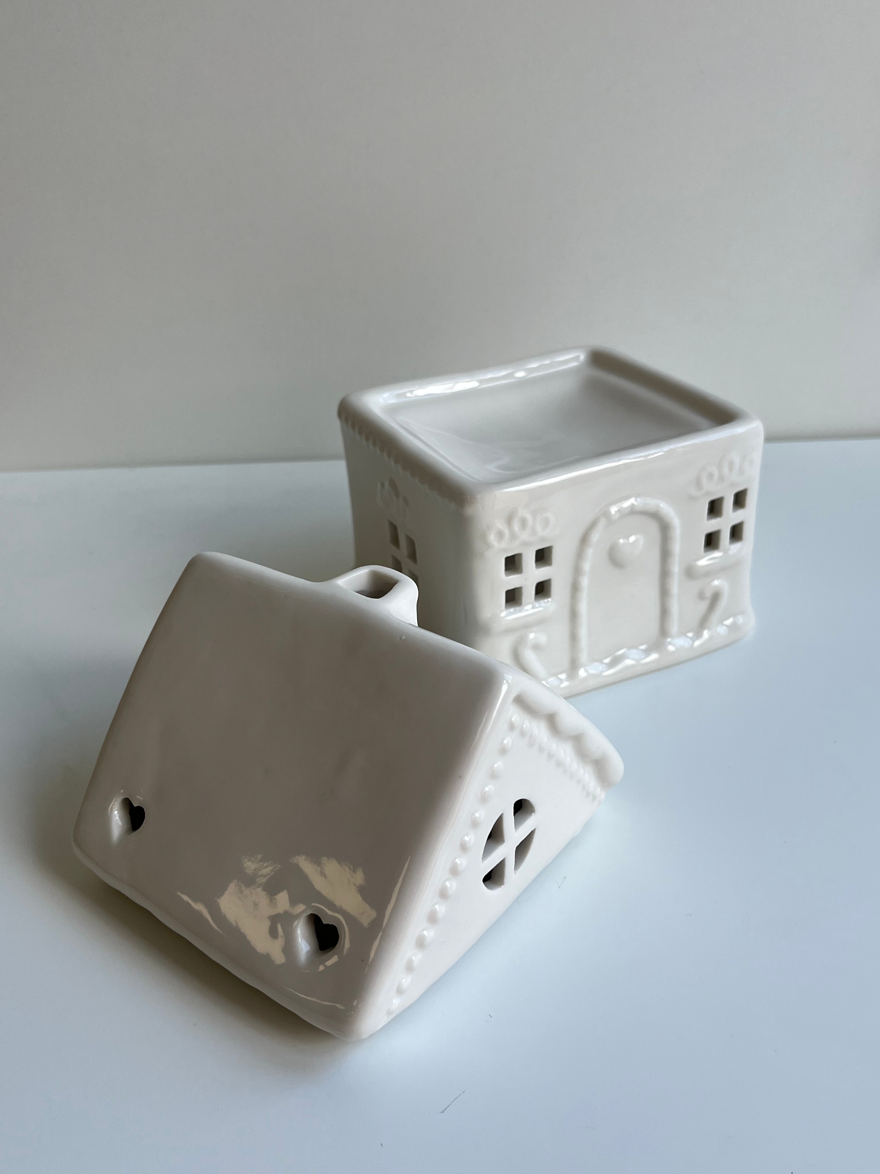 Quemador Casita artesanal acompañado de wax melts a escoger, ideal para perfumar el hogar y crear una atmósfera cálida y acogedora con fragancias naturales.