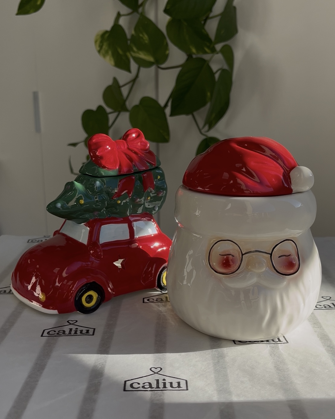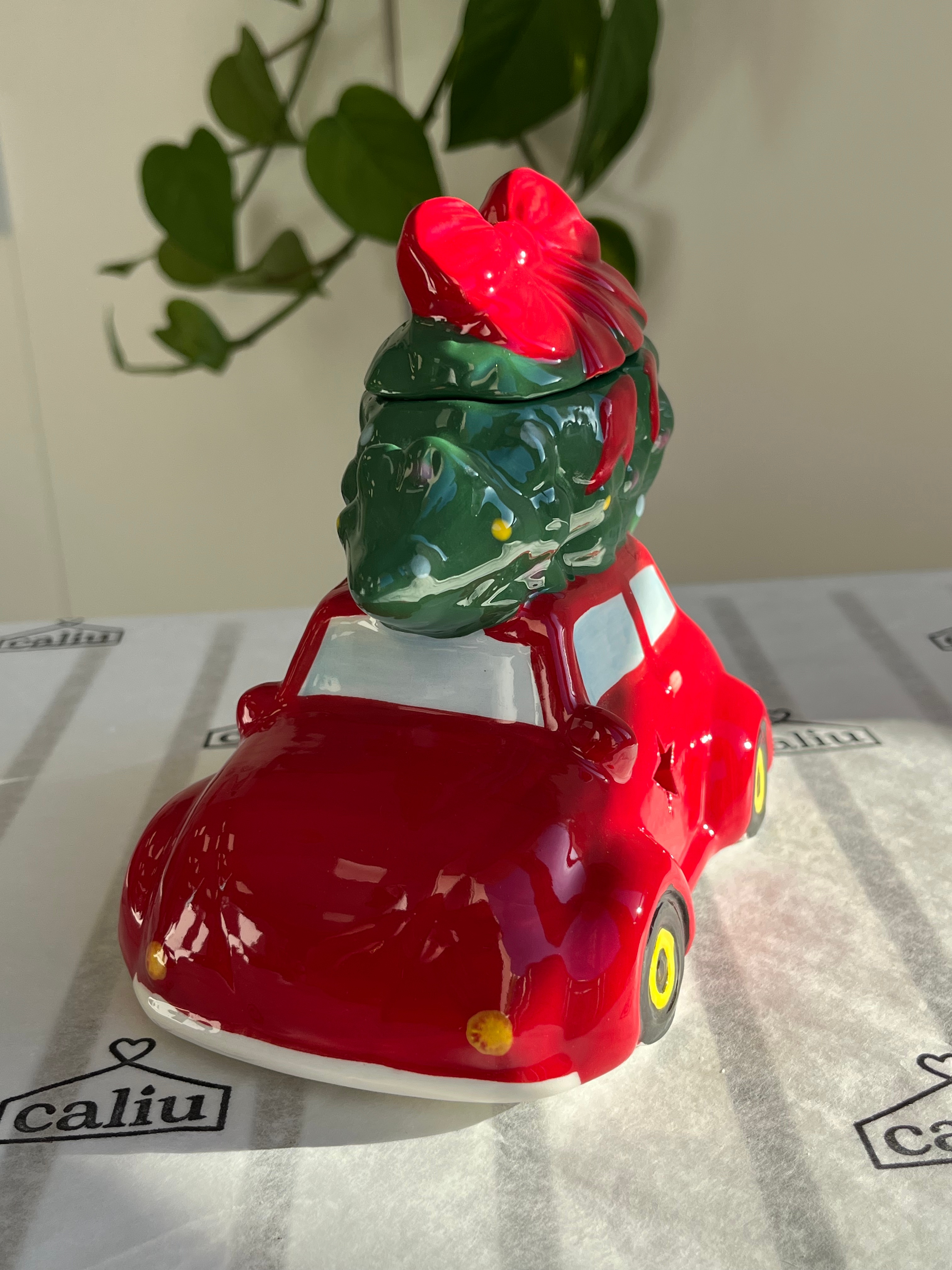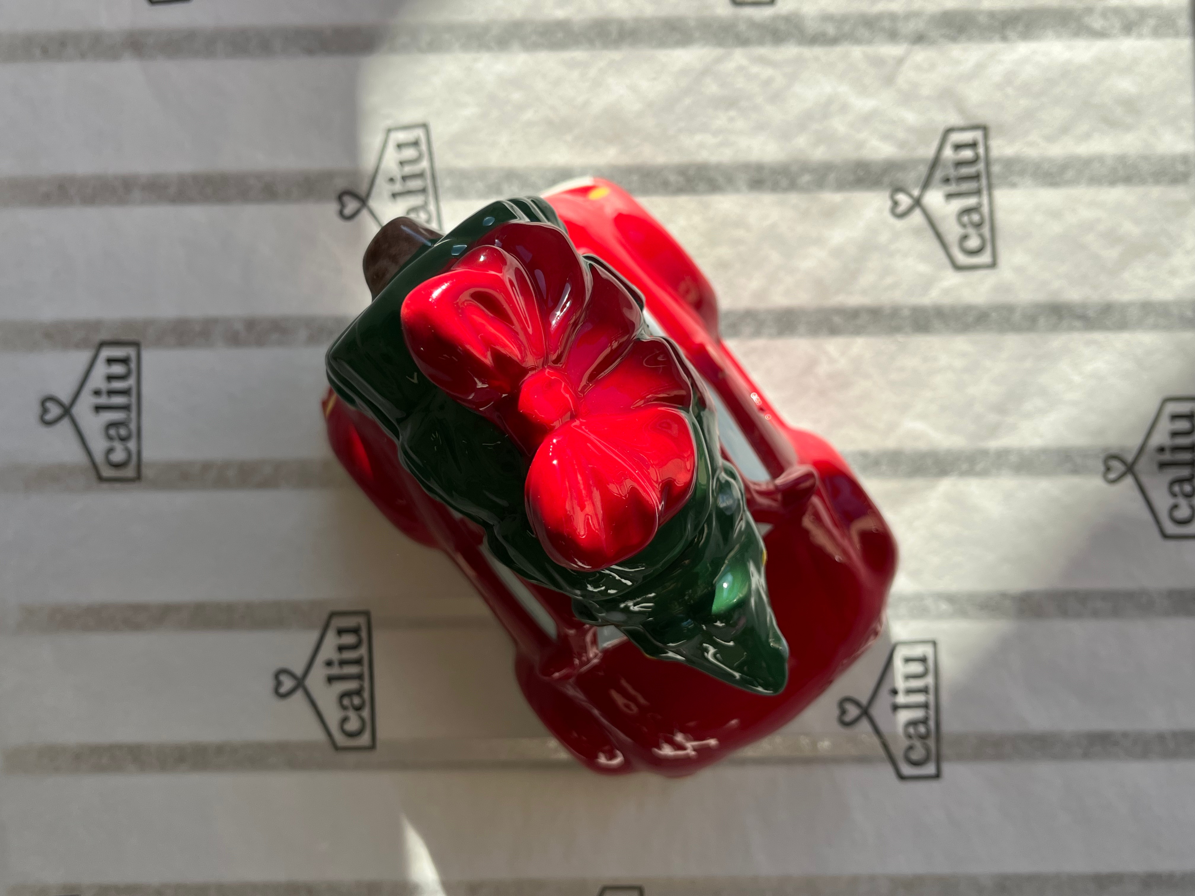 Aporta un toque vintage y lleno de nostalgia a tu hogar con este quemador de cerámica con forma de coche rojo clásico que transporta un árbol de Navidad.