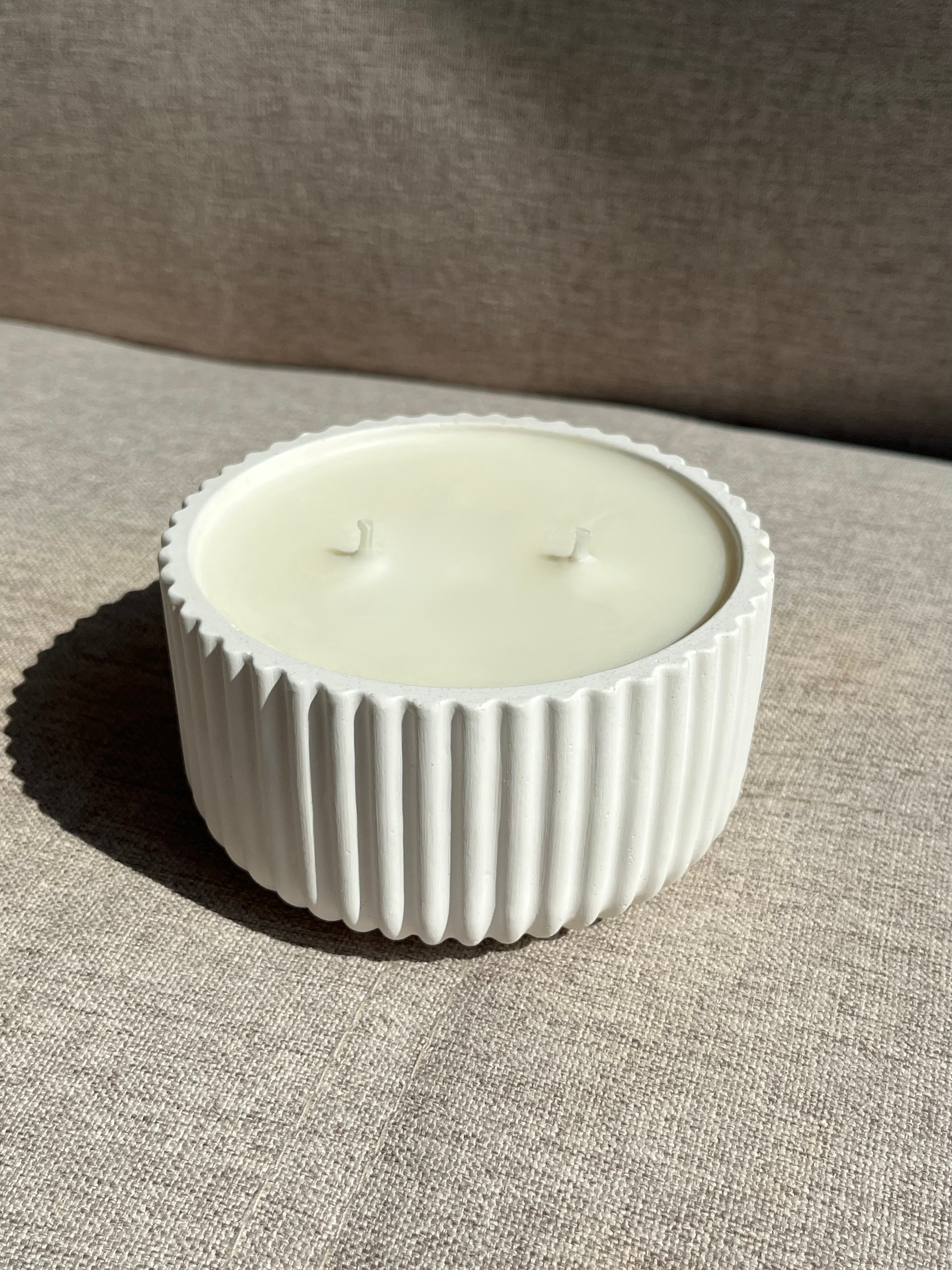 Grande, rallada, profunda. "Calma" no tiene prisa. Y tampoco te la pide. Es una vela de presencia serena, con cuerpo generoso y líneas verticales ralladas que recuerdan al fluir del agua, al paso del tiempo cuando todo va bien.