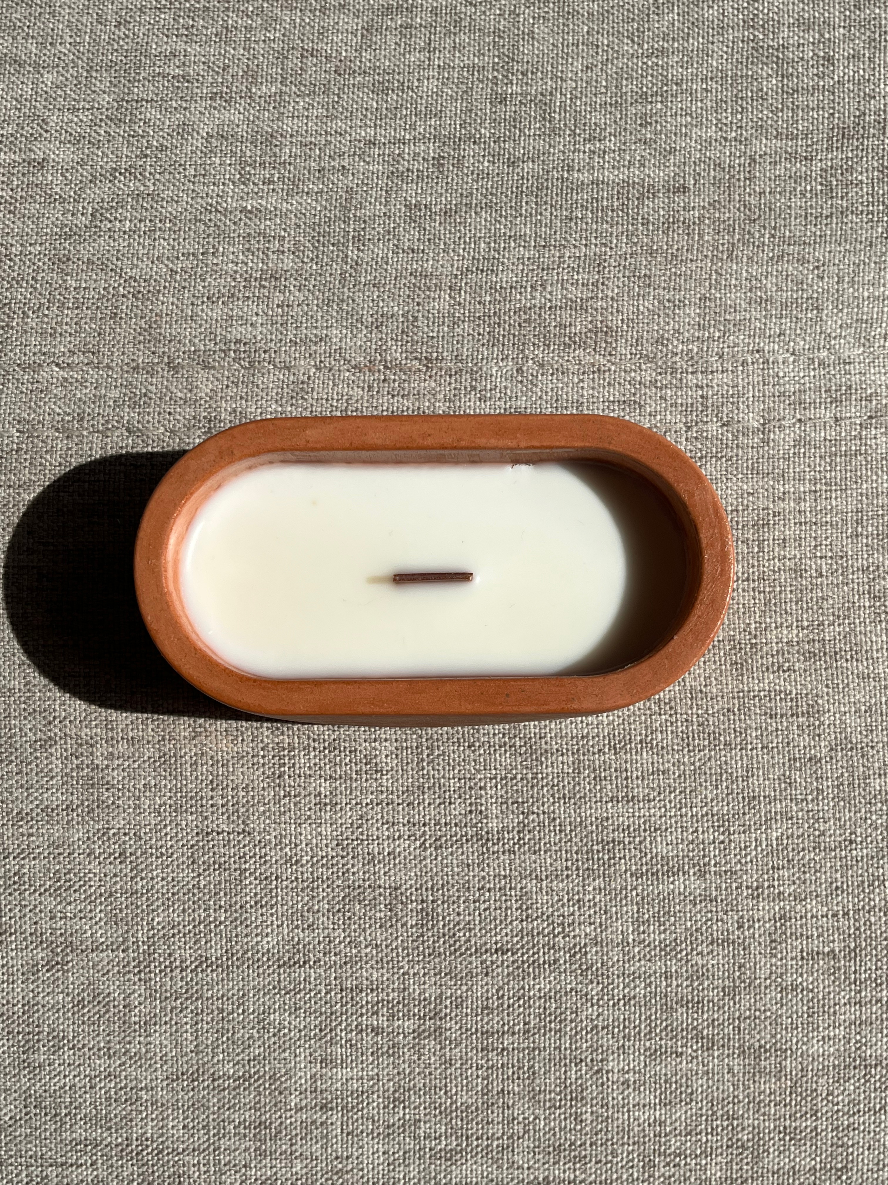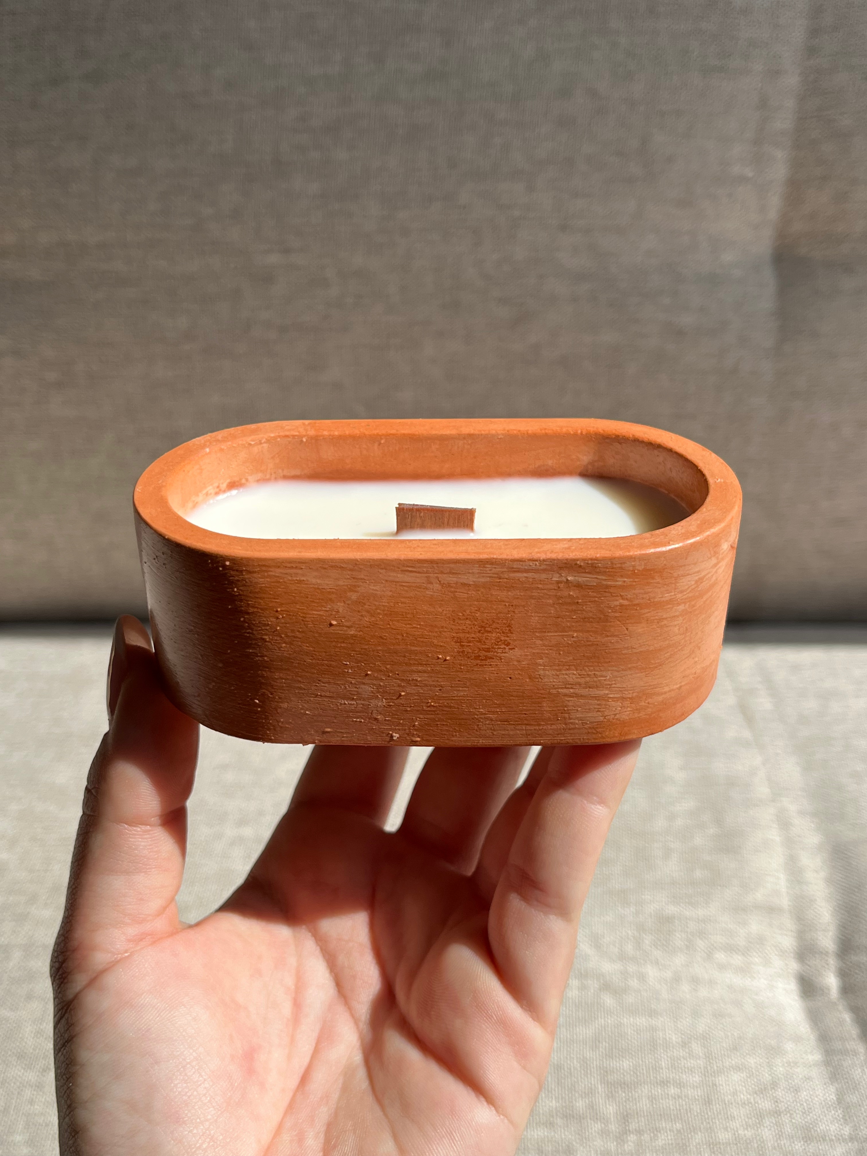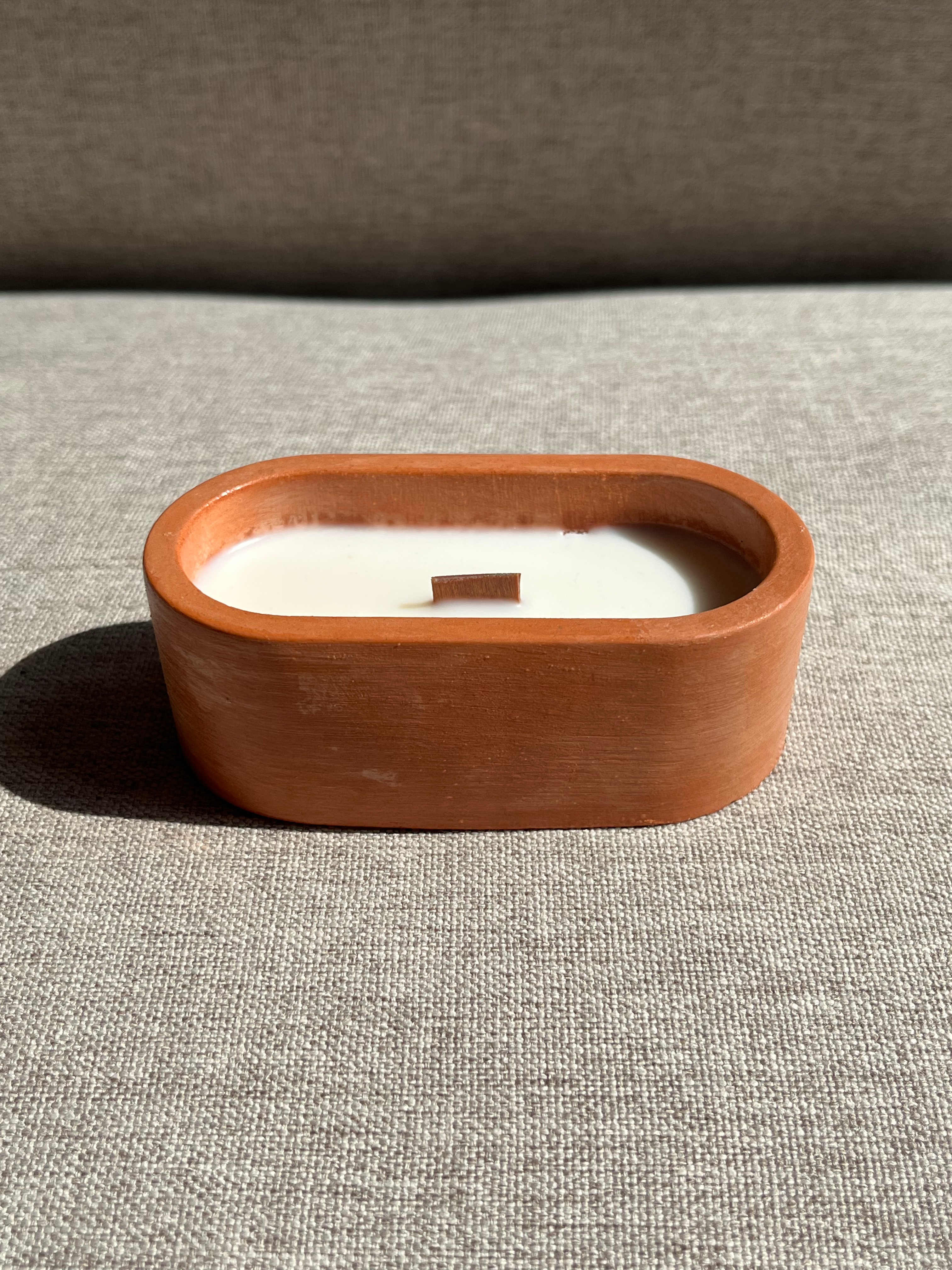 Vela alargada con pabilo de madera y aroma de Coco y Karité, pieza única.