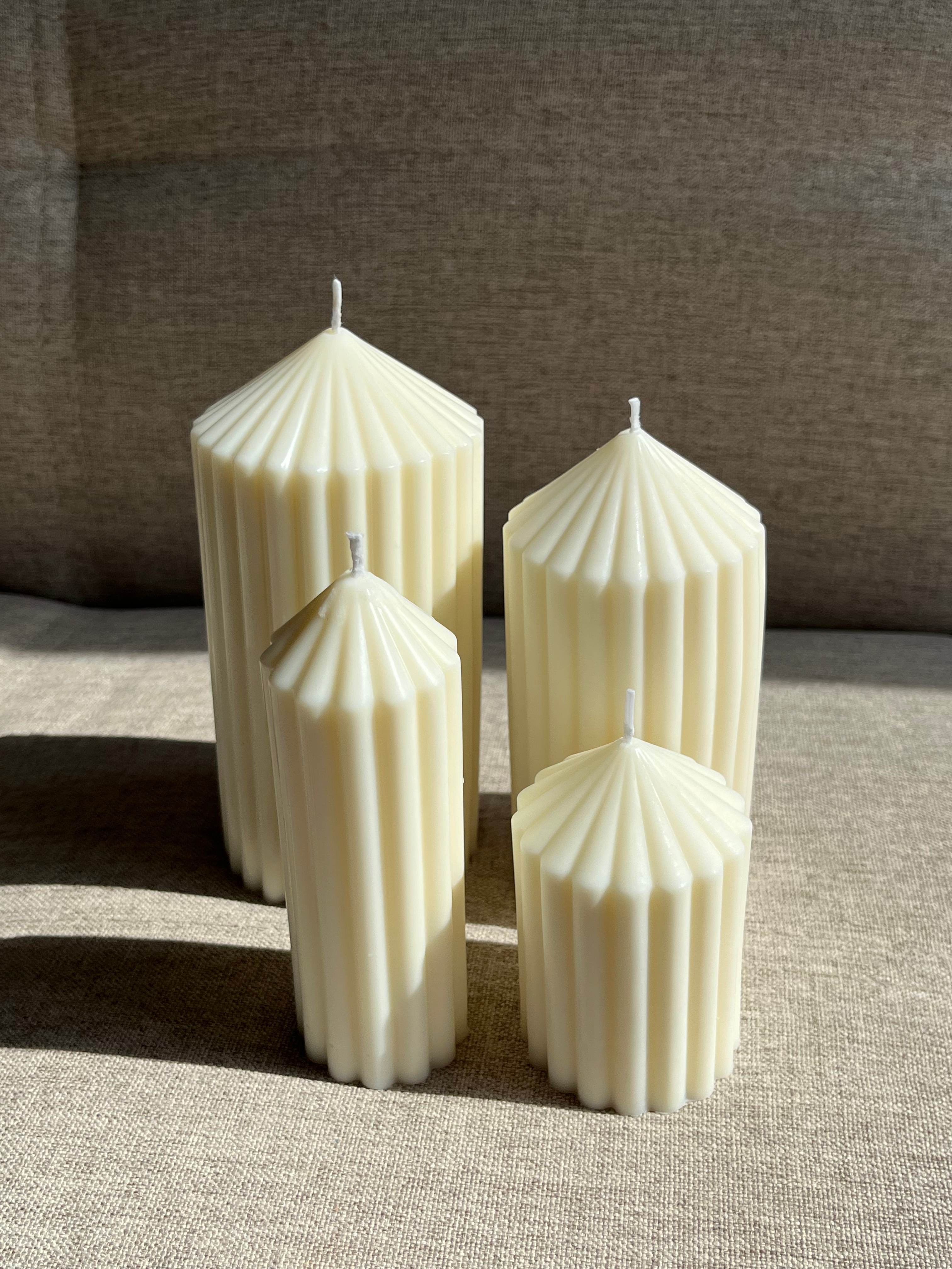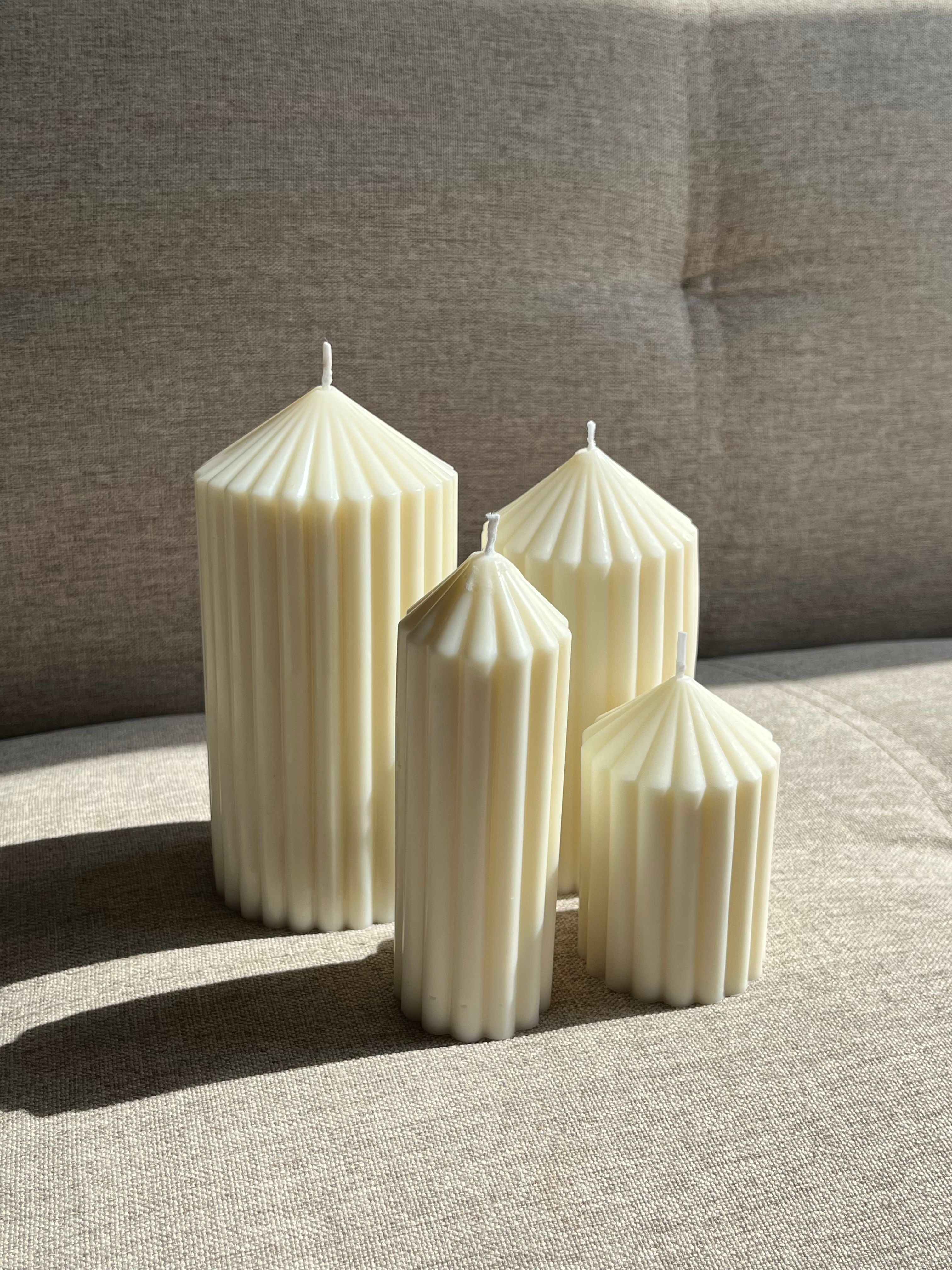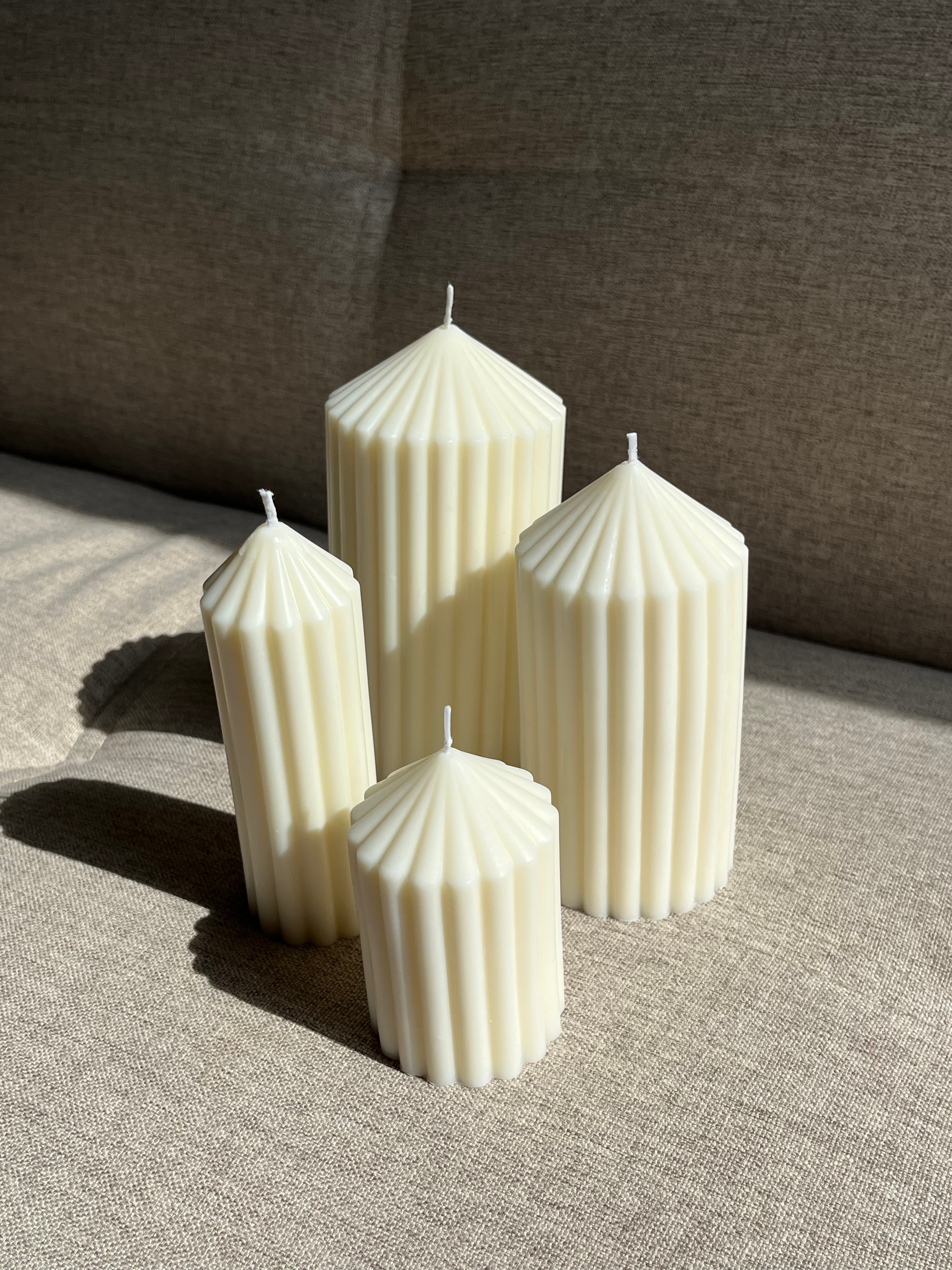 - Versatilidad en el hogar: Cada vela cumple una función distinta: la grande como centro de atención, la mediana para acompañar otros elementos, la fina para espacios estrechos y la bajita para detalles o agrupaciones, ofreciendo infinitas combinaciones que crean armonía y ritmo visual.